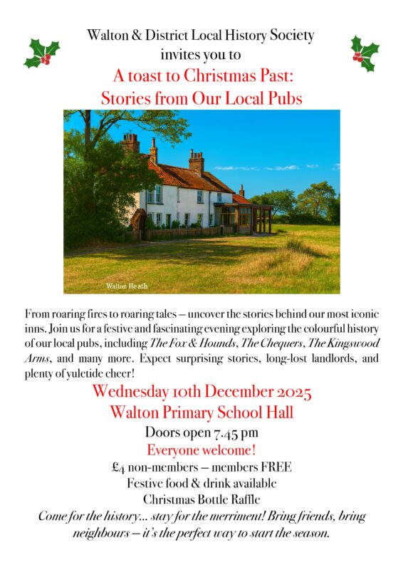 The Christmas Meeting will take place on Wednesday 10 December, at 8pm in Walton on the Hill Primary School, Walton Street, WOTH, KT20 7RR. A talk on Houses and Pubs through time will be given by Lorraine Spindler and Tim Richardson